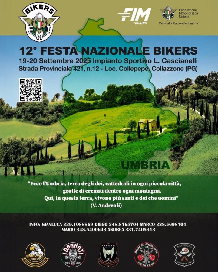 Quest’anno sarà l’Umbria ad accogliere i motociclisti provenienti da ogni parte d’Italia e, per la prima volta, anche dall’estero. L’organizzazione dell’evento è affidata a cinque dei nostri Moto Club umbri, tutti attivi all’interno del progetto Bikers FMI e protagonisti nella valorizzazione del motociclismo sul territorio; Moto Club Brigata Bikers, i Dannati, i Naharti Numen, i Rock Riders e gli Scarfaces. Il loro impegno congiunto garantirà ai partecipanti un’esperienza autentica, ricca di contenuti e curata in ogni dettaglio.