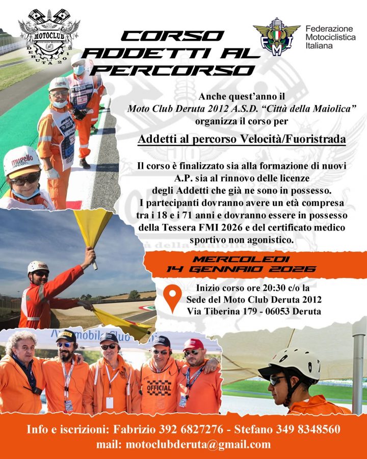 Il 2026 parte subito da un punto cardine per FMI…la formazione! Grazie agli amici del Motoclub Deruta 2102 – Città della Maiolica , mercoledì 14 gennaio, si svolgeranno i corsi di formazione per gli Addetti al Percorso – Velocità e Fuoristrada. Il corso è finalizzato sia alla formazione di nuovi A.P. sia al rinnovo delle licenze degli Addetti che già ne sono in possesso. I partecipanti dovranno avere un età compresa tra i 18 e i 71 anni e dovranno essere in possesso della Tessera FMI 2026 e del certificato medico sportivo non agonistico.