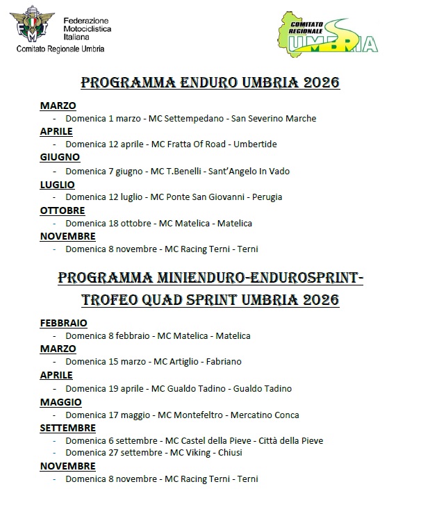 CALENDARIO CAMPIONATO ENDURO UMBRIA-MARCHE FMI 2026