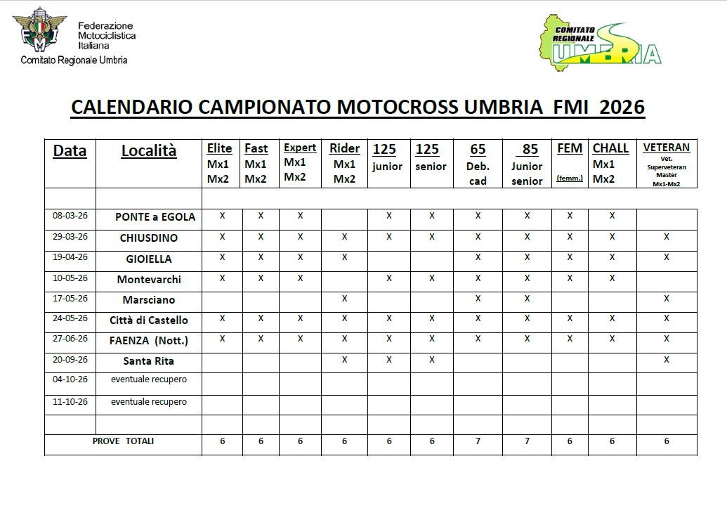 CALENDARIO CAMPIONATO MOTOCROSS UMBRIA FMI 2026