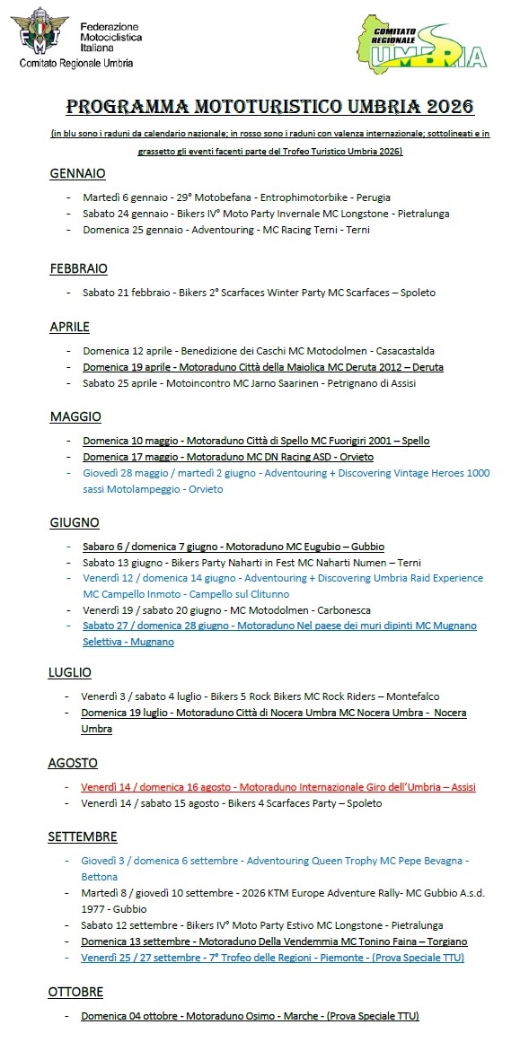 CALENDARIO MOTOTURISMO E TROFEO TURISTICO UMBRIA FMI 2026